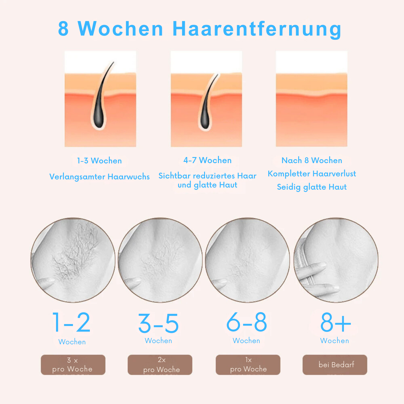 - Zeitsparend: Eine kurze wöchentliche Anwendung reicht aus, um dauerhaft glatte Haut zu genießen – keine tägliche Rasur mehr nötig.